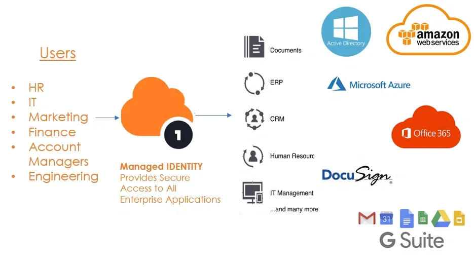 Whether you’re a small startup or large business, Managed IDENTITY provides an easy-to-implement Identity and Access Management (IAM) solution for your workforce. Employees, partners, and even customers will be delighted with the ease of Managed IDENTITY’s single sign-on (SSO) access to information and apps—including common applications like G Suite, Microsoft Office 365 and Salesforce. Managed IDENTITY supports innovation by enabling access to your custom applications, too.